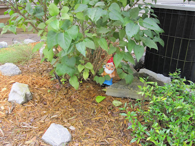 Anyway since the absence of Flat Stanley things have been quiet lately that is until we had another visitor. We're really not sure of the little guys name because he doesn't say much. He justs hangs out in our gardens and hides behind the trees and bushes.